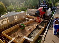 Далее устанавливаем подставки под памятники, заливаем их бетоном и ещё раз кладём подложку.