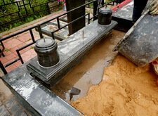 Приступаем к работе с цветниками. Один уже был в наличии, поэтому делаем второй, идентичный. По проекту цветники должны смотреться одинаково даже несмотря на то, что памятники будут разные. В это же время укладываем гранитную брусчатку уже на территорию места захоронения.
